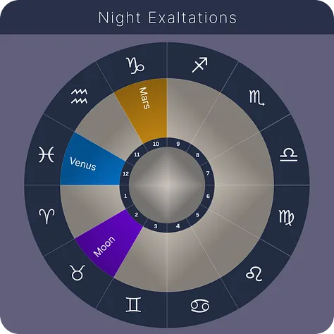 We can now look at the remaining two nocturnal planets, Venus and Mars. As with the Moon, we should see a sextile relationship between the rulership sign and the exaltation sign.