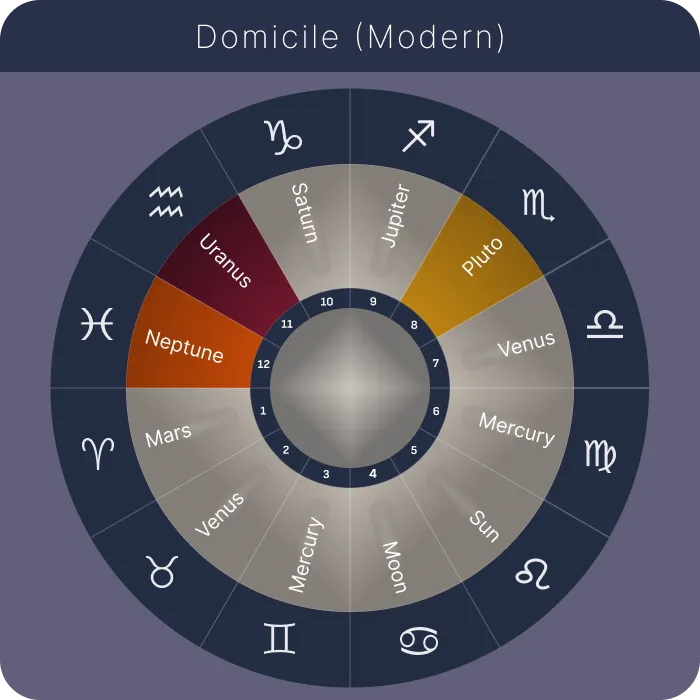 Referring back to the first two wheels in this section showing the traditional and modern domiciles, I have used color to highlight the signs where the domicile assignments differ in these systems. The yellow color4 in the wheel shows that, in modern astrology, Pluto takes the place of Mars as the domicile lord of Scorpio. The red color shows that Uranus takes the place of Saturn as the domicile lord of Aquarius. Finally, the orange color shows that Neptune takes the place of Jupiter as the domicile lord of Pisces.
