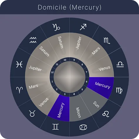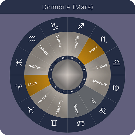 The primary essential dignities are domicile, which most modern astrologers know as rulership, and exaltation. If you know the basics of astrology, you most likely know the rulerships, or domicile signs. In this scheme, Mars rules Aries, or is in its domicile (at home) in Aries. Venus is in its domicile in Taurus. Mercury is in its domicile in Gemini. And so on.