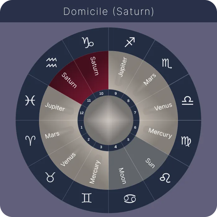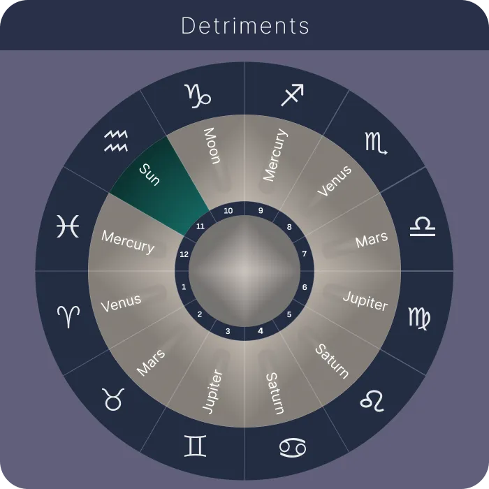 Notice that the Sun and Moon are in their detriment in Aquarius and Capricorn, respectively, the signs furthest away from Leo and Cancer. Notice also that these signs are ruled by the planets furthest away from the Sun, where the light is dimmest.7