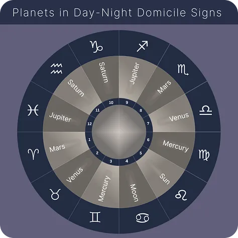 To finish up with the sect of the signs, here is a list of the signs divided into day and night with associated planetary domicile rulers.