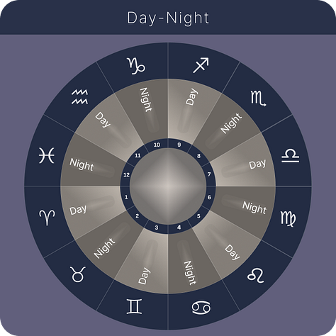 Brennan also points out that the scheme for the exaltation sign assignments seems to draw on another technique in traditional astrology known as sect.10 The sect scheme permeates the traditional tropical astrology system, with planets, signs, and charts themselves all categorized based on it. In general terms, sect distinguishes between day (diurnal) and night (nocturnal), or yin and yang. Let’s look at how that works for the signs, planets, and charts.